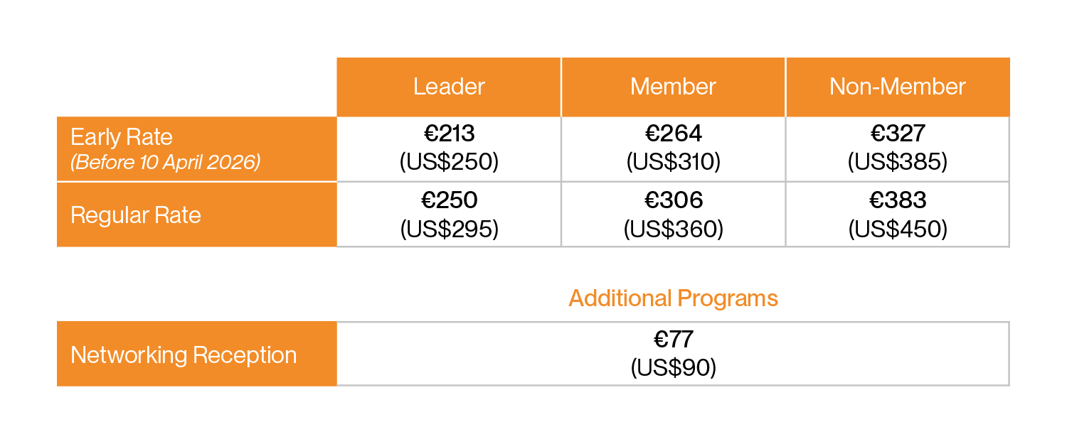 • A 100% refund, minus a US$50 refund fee & the original processing fees (per attendee), will be given if written notice of cancellation is received by 15 April 2026.